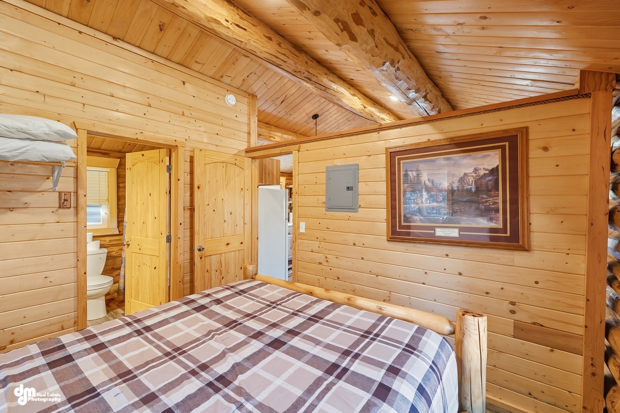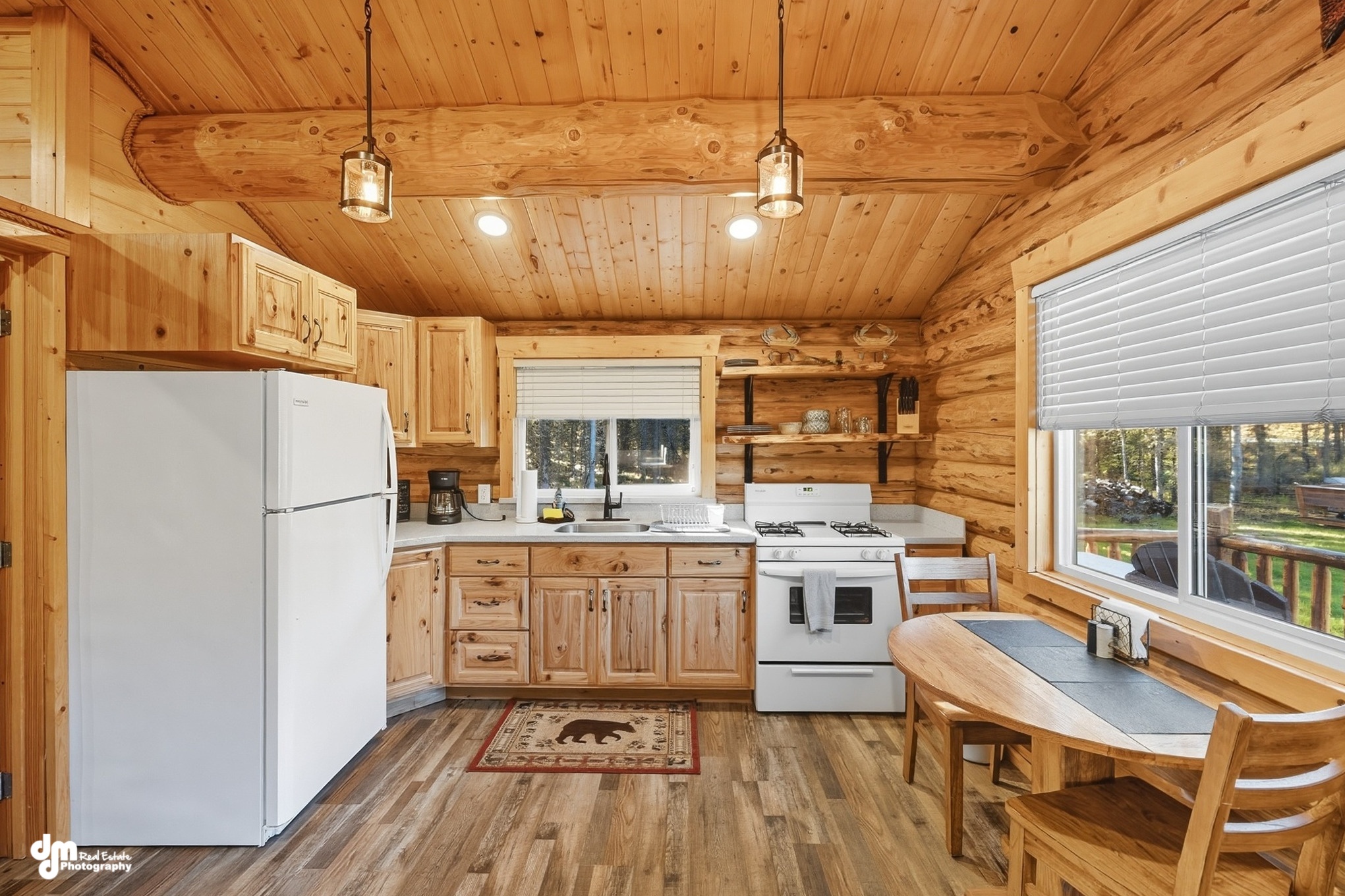 In the dining room, you will find a beautiful custom-made dining table with ample seating. The living room has extremely large, picturesque windows, providing an opportunity to see some of the wildlife that likes to visit the lodge. It allows for your group to gather comfortably in our electric reclining couches and chairs. All are equipped with USB chargers for your cell phones or other devices. Enjoy the large flat-screen television with plenty of seating and complimentary WiFi throughout the lodge.