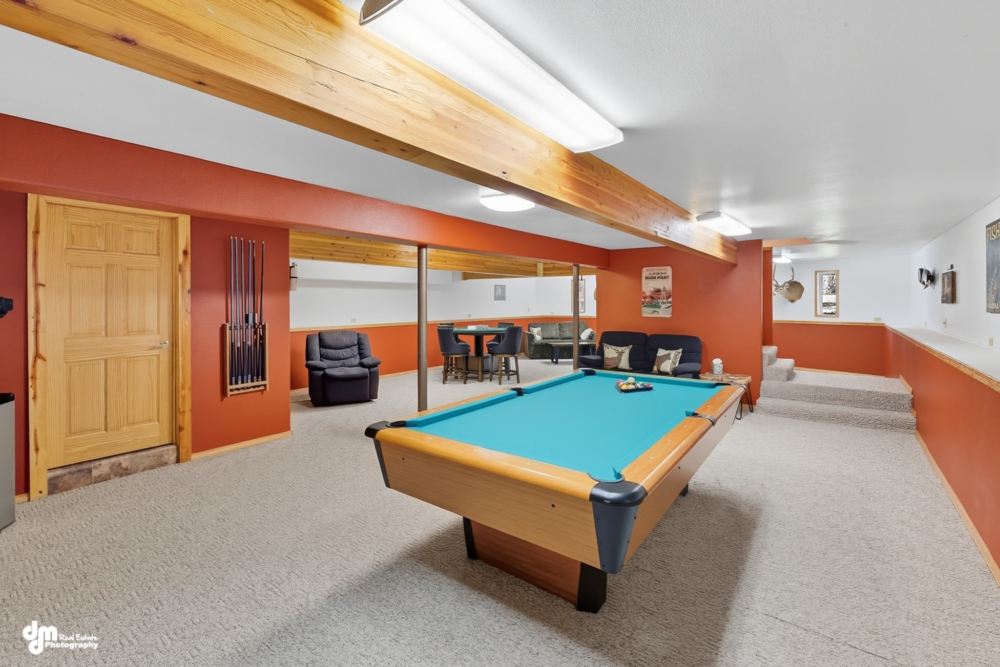 Other common areas include the lower-level game room where guests can play a game of pool, a game of poker, board games, or watch another large flat-screen TV. The game room offers another option for ample seating space with reclining couches and chairs for guests to relax. The lodge hosts two on-site laundry facilities. These are available for guests free of use, including provided laundry detergent, fabric softener, and stain remover.