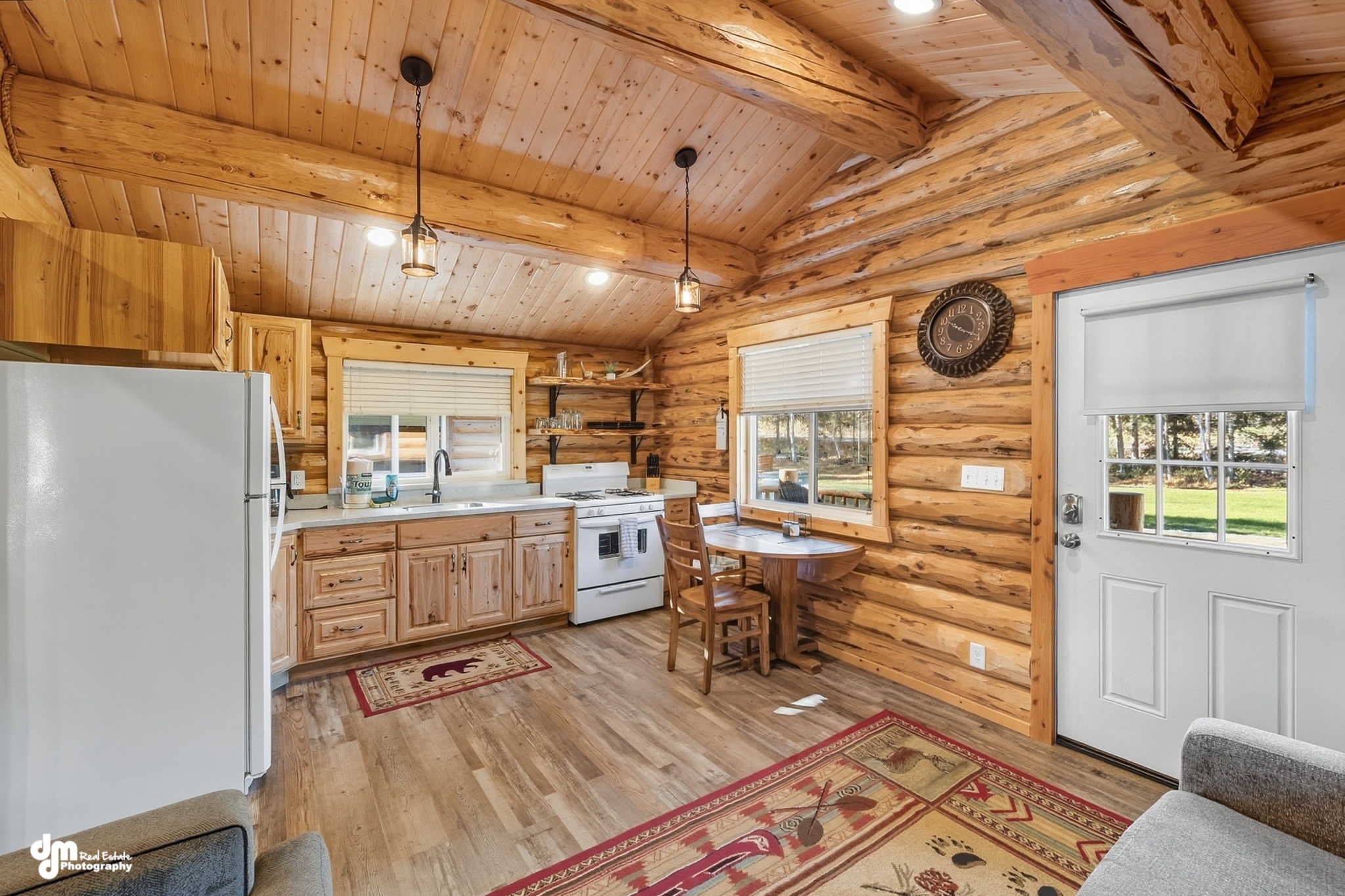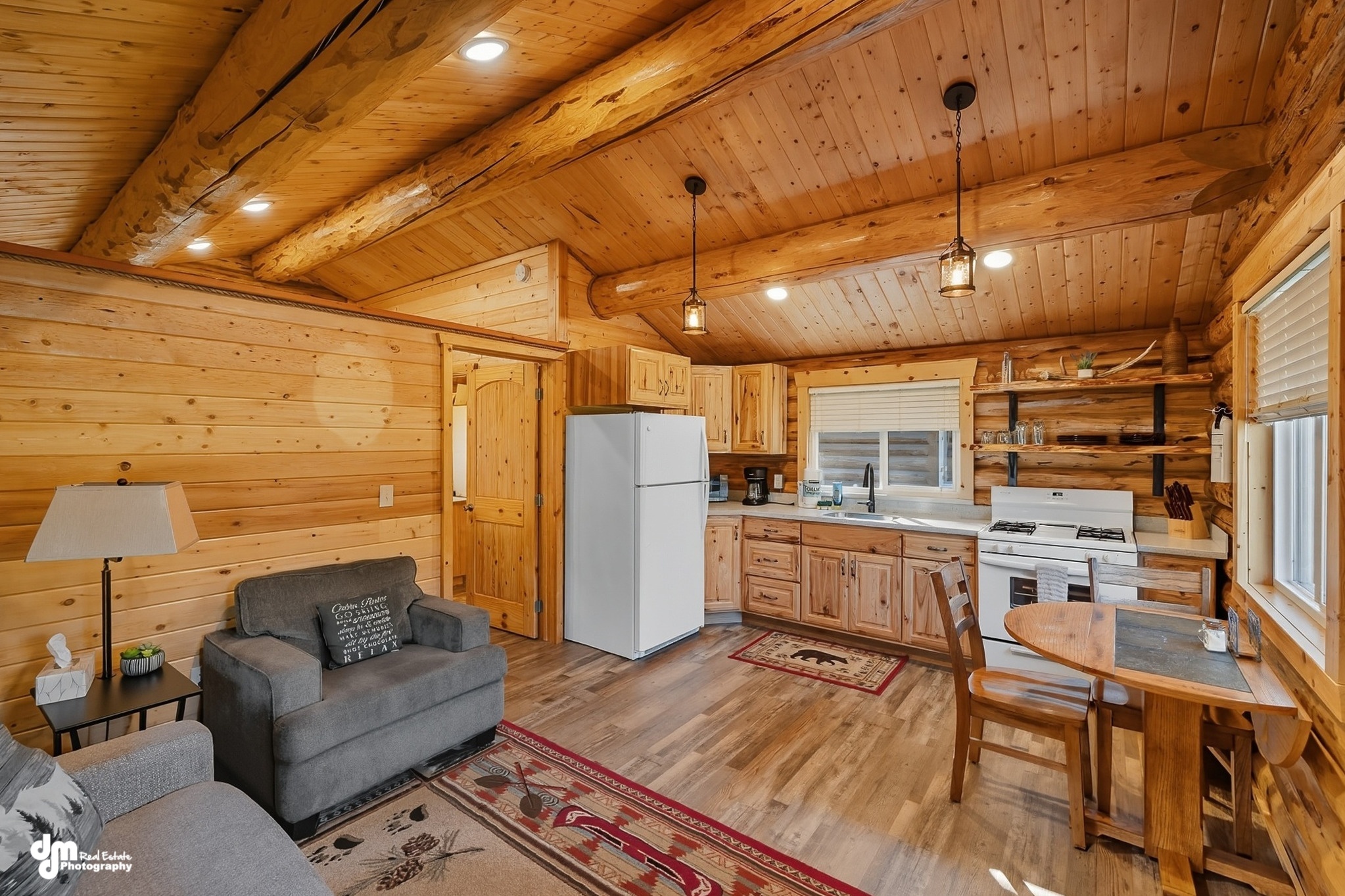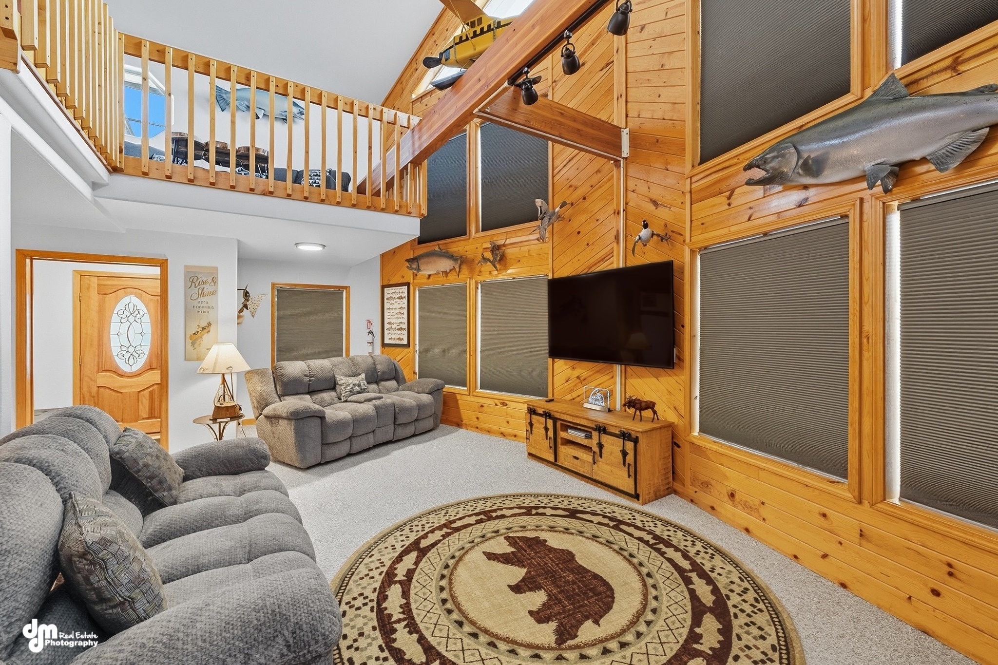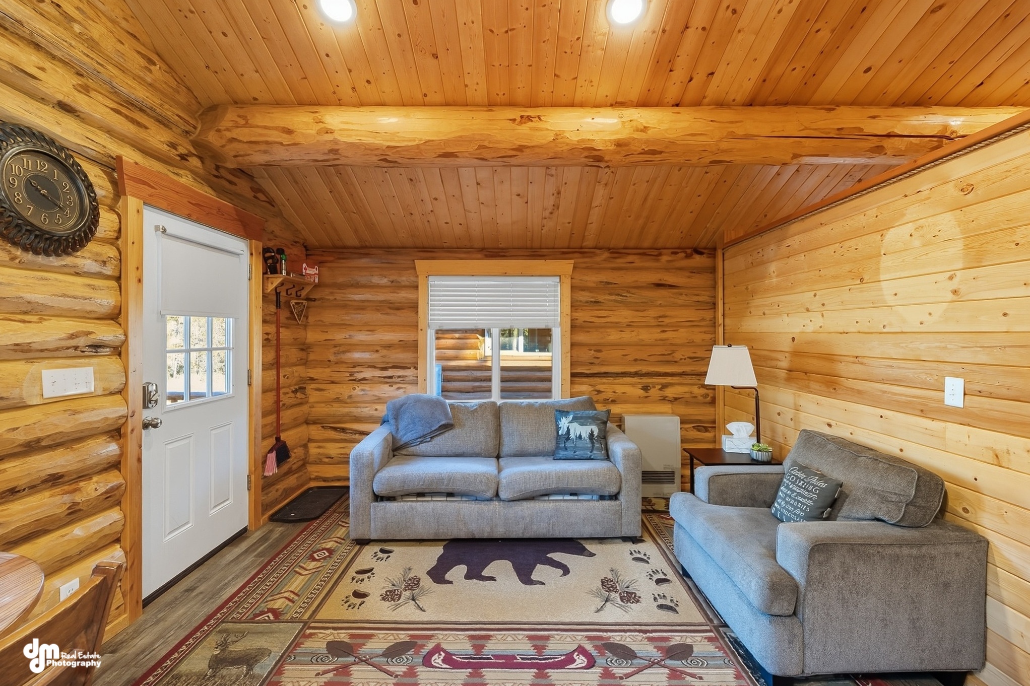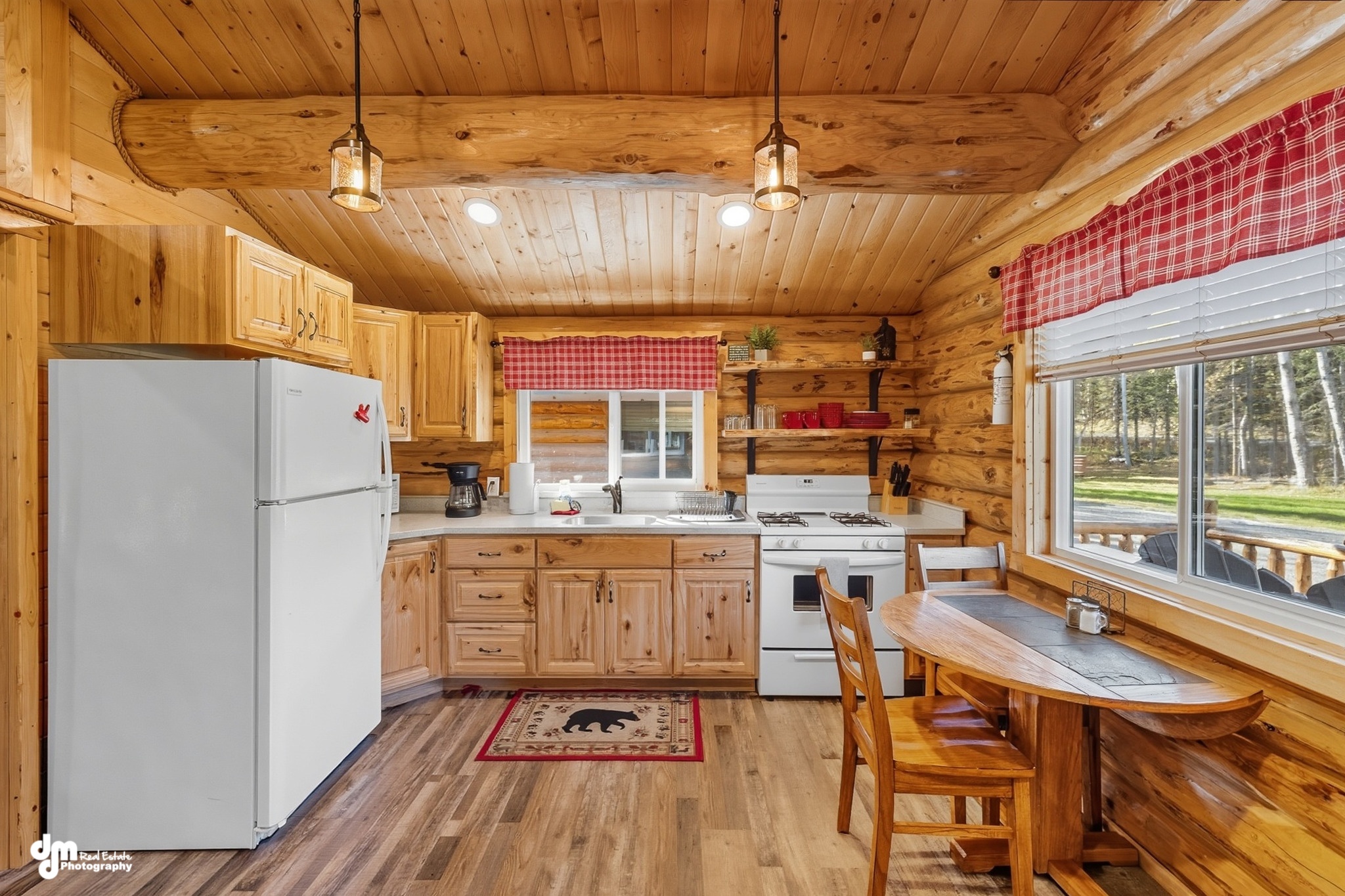 In the dining room, you will find a beautiful custom-made dining table with ample seating. The living room has extremely large, picturesque windows, providing an opportunity to see some of the wildlife that likes to visit the lodge. It allows for your group to gather comfortably in our electric reclining couches and chairs. All are equipped with USB chargers for your cell phones or other devices. Enjoy the large flat-screen television with plenty of seating and complimentary WiFi throughout the lodge.