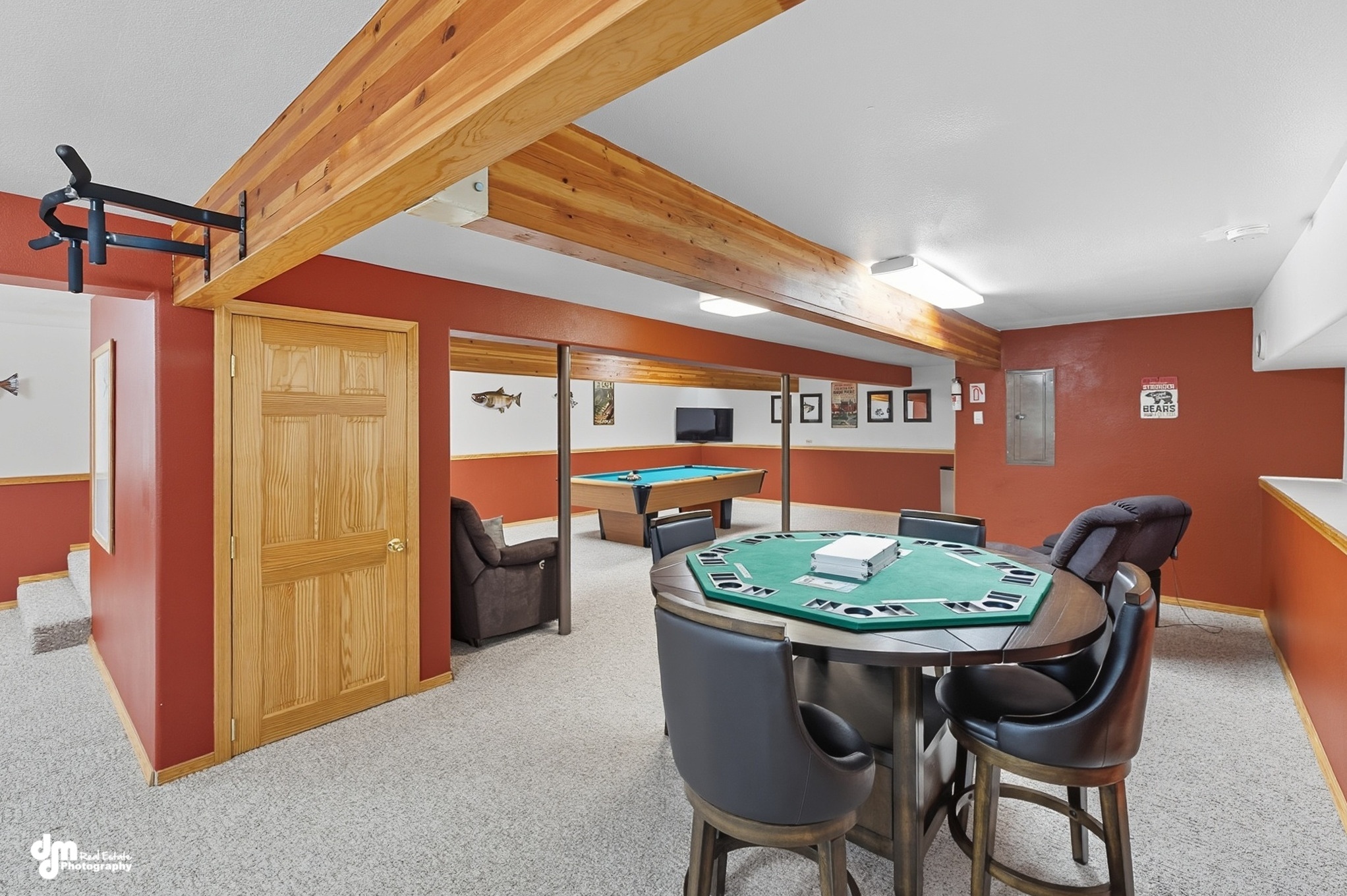 Other common areas include the lower-level game room where guests can play a game of pool, a game of poker, board games, or watch another large flat-screen TV. The game room offers another option for ample seating space with reclining couches and chairs for guests to relax. The lodge hosts two on-site laundry facilities. These are available for guests free of use, including provided laundry detergent, fabric softener, and stain remover.